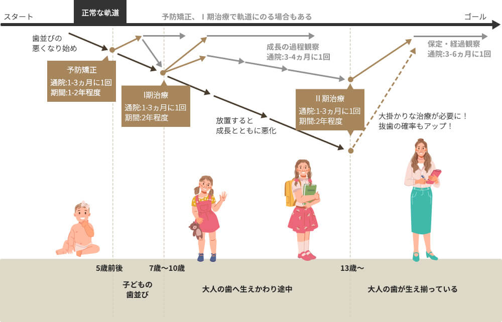 小児矯正は「Ⅰ期治療」と「Ⅱ期治療」の2段階に分かれて進めるのが一般的です。Ⅰ期治療では、顎の成長を利用しながら、歯が並ぶための土台作りを行います。Ⅱ期治療では、永久歯が生えそろった状態で、歯並びや噛み合わせを仕上げていきます。当院では、お子さんの成長や口腔内の状況を見ながら、どのタイミングでどんな治療を行うかを丁寧にご説明し、ご家族と一緒に治療計画を立ててまいります。